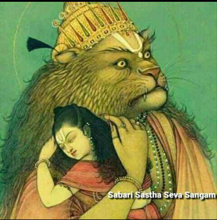 Prahlāda was born to Kayadu and Hiranyakashipu, an evil daitya king who had been granted a boon that he could not be killed of anything born from a living womb, neither be killed by a man nor an animal, neither during the day nor at night, neither indoors nor outdoors, neither on land, nor in the air nor in water and of no man made weapon! However, after repeated attempts of filicide by Hiranyakashipu unto Prahalāda, Prahalāda was finally saved by Lord Narasimha, a prominent avatar of Vishnu who descended to demonstrate the quality of Divine rage and redemption by killing the demon king. The word “Narsimha” is derived from the Sanskrit word” nar” meaning Man and “simaha” meaning lion. Thus Narsimha to a being who is half man and half lion. Lord Narasiṁha, being the transcendental Supreme Personality of Godhead, fulfilled all the proper requirements by which the otherwise nearly-invincible Hiranyakashipu could be killed.